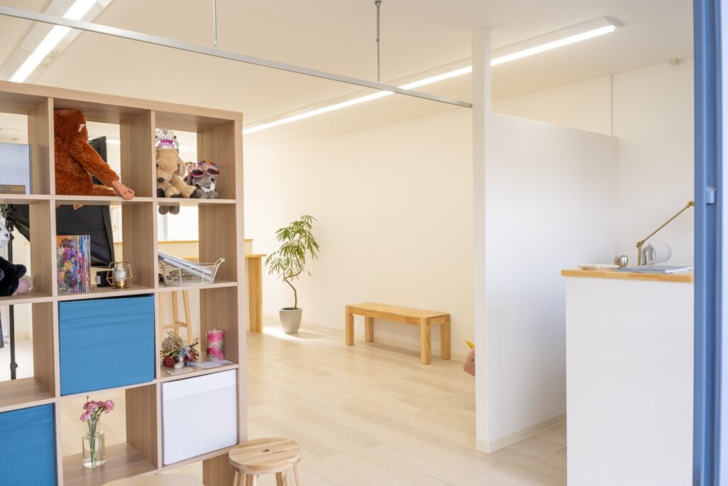 両面から使用できる家具でゆるく空間を仕切りながら、スタジオとして使うときにはカーテンを閉めて、プライベート空間で撮影できるようにしました。