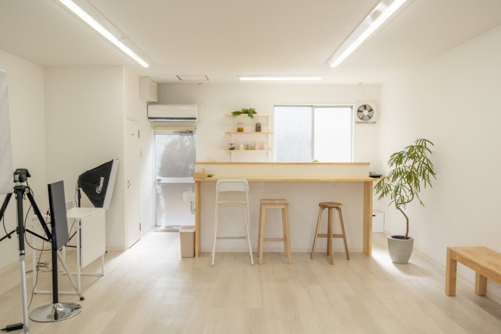 奥にはキッチンを備えたカフェコーナーを設え、イベントも開催できるスタジオになりました♪