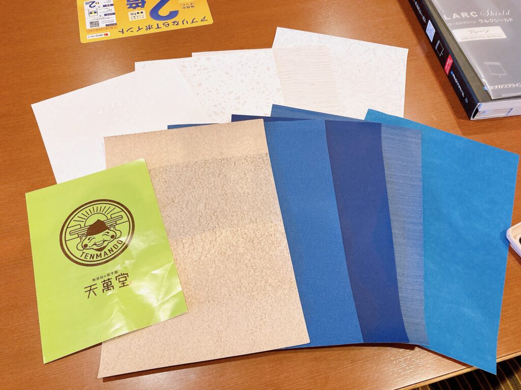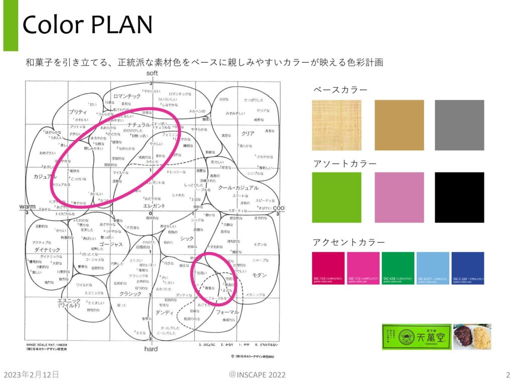 単にカラフルにすることもできますが、正統派な和菓子が美味しそうに引き立てられる色彩計画で、コーディネートを進めました。