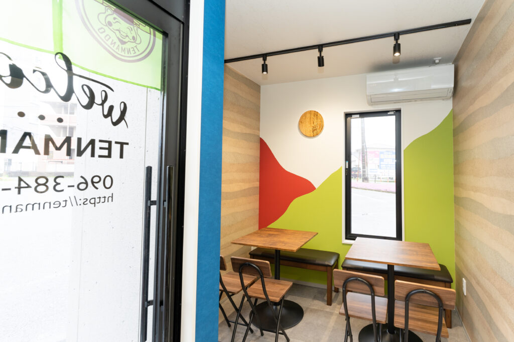 イートインスペースには、クロスを貼り分けてアクセントにしています。
