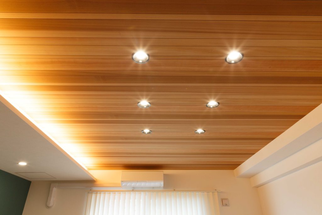こだわりの天井はレッドシダー。ダクトスペースの天井の段差を活用して間接照明を設置しました。